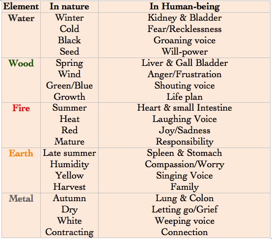 Through the associations made with the elements there arises a language to describe the world and a way to observe and determine the constitution of a person. There are many correspondences associated with each element, here is a brief outline pertaining to the 5 element diagnosis.